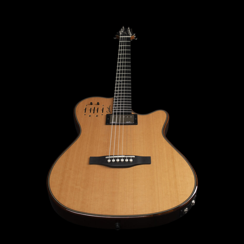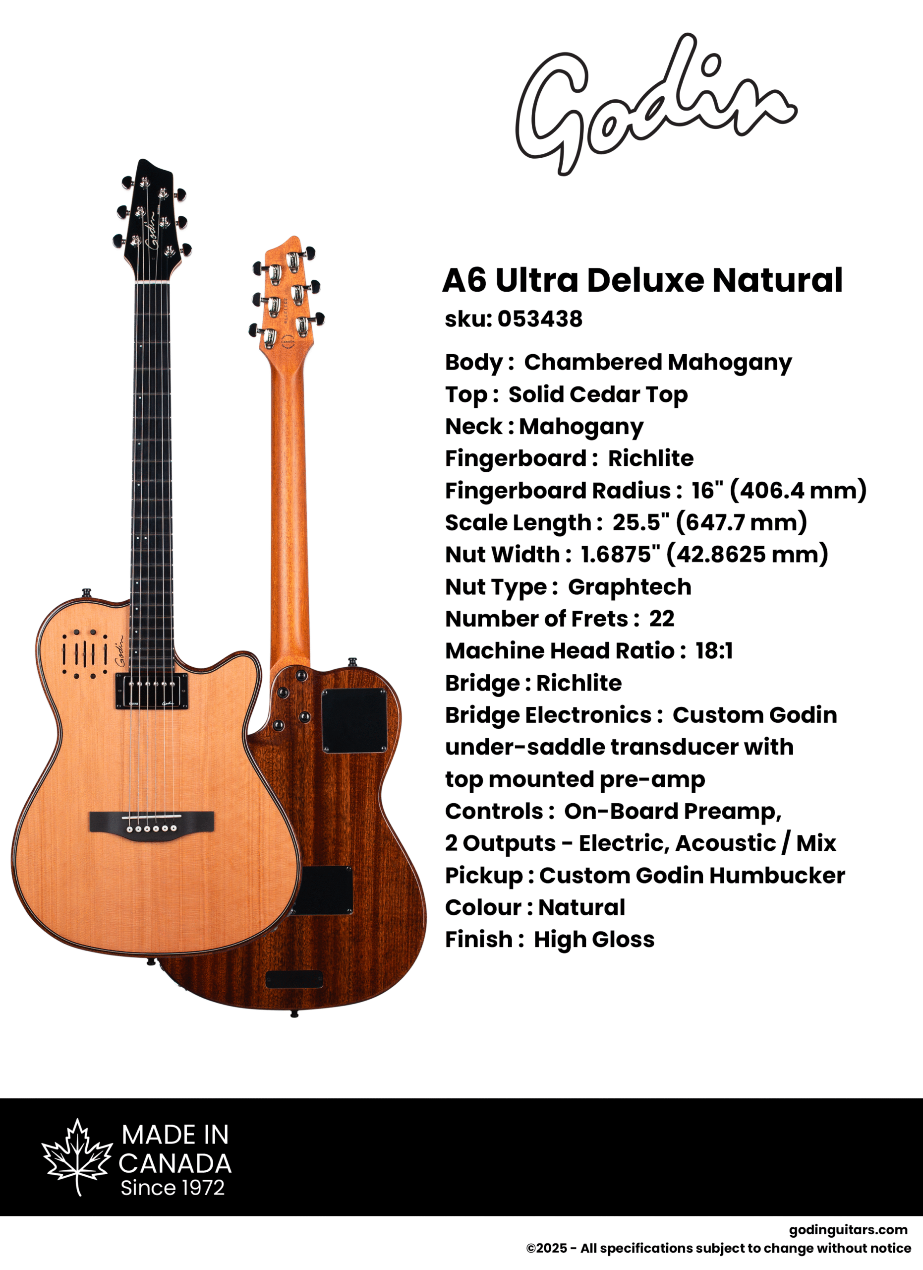 La A6 Ultra Dlx Naturel incarne l’excellence et la polyvalence. Son corps en acajou évidé, surmonté d’une table en cèdre massif, délivre une résonance chaleureuse et une projection sonore naturelle, parfaite pour une grande variété de styles musicaux. Le manche vissé en acajou, combiné à la touche en Richlite, garantit une jouabilité fluide et agréable. Équipée d’un micro Godin Custom à double bobinage et d’un capteur sous-sillet, cette guitare permet de passer aisément d’un son acoustique riche à des tonalités électriques percutantes, grâce à son préampli intégré et ses deux sorties dédiées (électrique, acoustique ou mixte). Sa configuration avancée offre un contrôle total sur chaque performance, que ce soit en studio ou sur scène. Le fini Naturel lustré magnifie la beauté du bois, tetis que ses composants de haute qualité assurent une fiabilité irréprochable. Polyvalente, élégante et, naturellement, fabriquée au Canada, la A6 Ultra Deluxe Naturel est l'instrument idéal pour les musiciens à la recherche d’un son exceptionnel et d’une performance sans compromis.