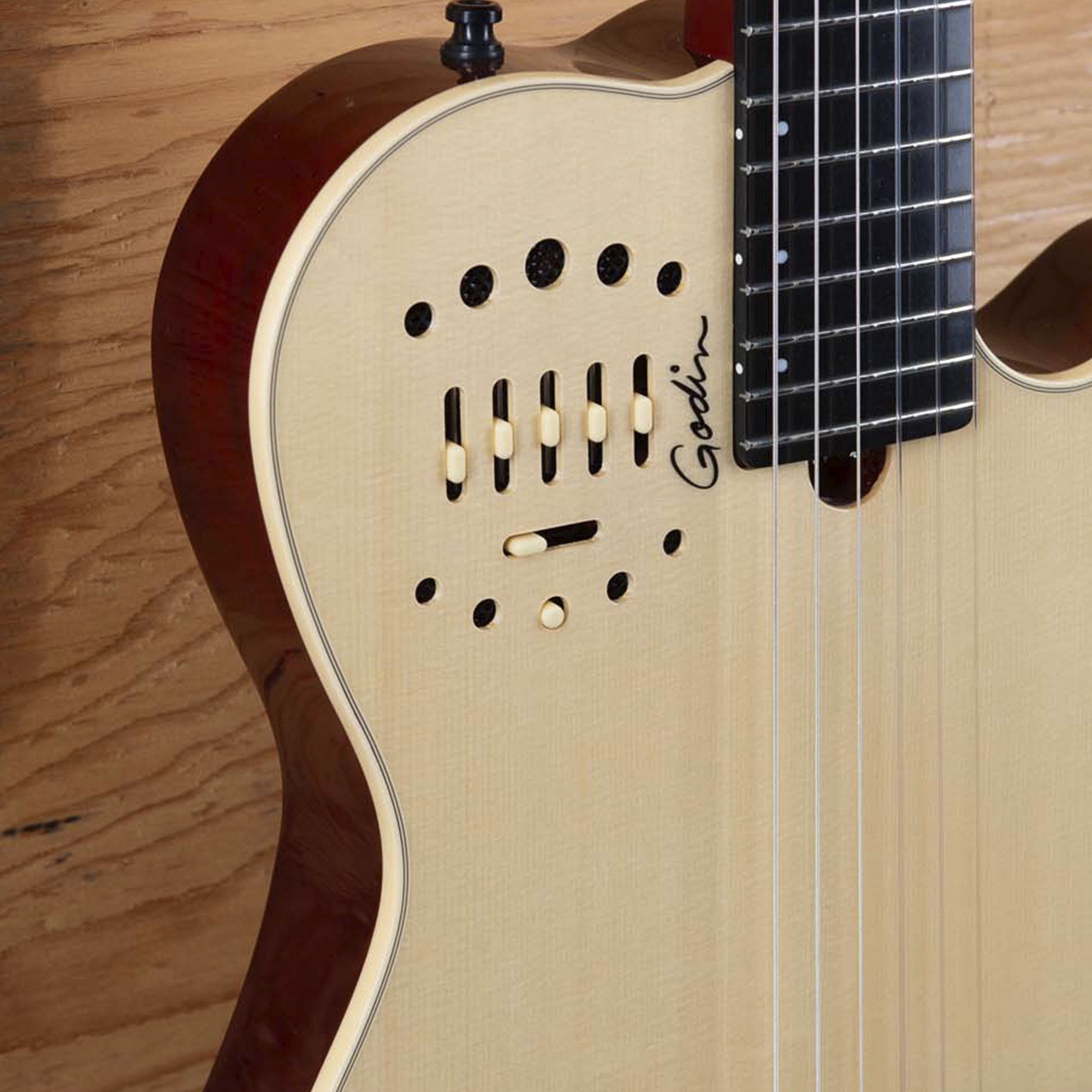 Électronique : Électronique LR Baggs personnalisée, son mélangeable avec micro Lyric, six capteurs individuels intégrés aux sillets, simulation de saturation à bande ajustable et contrôle de phase