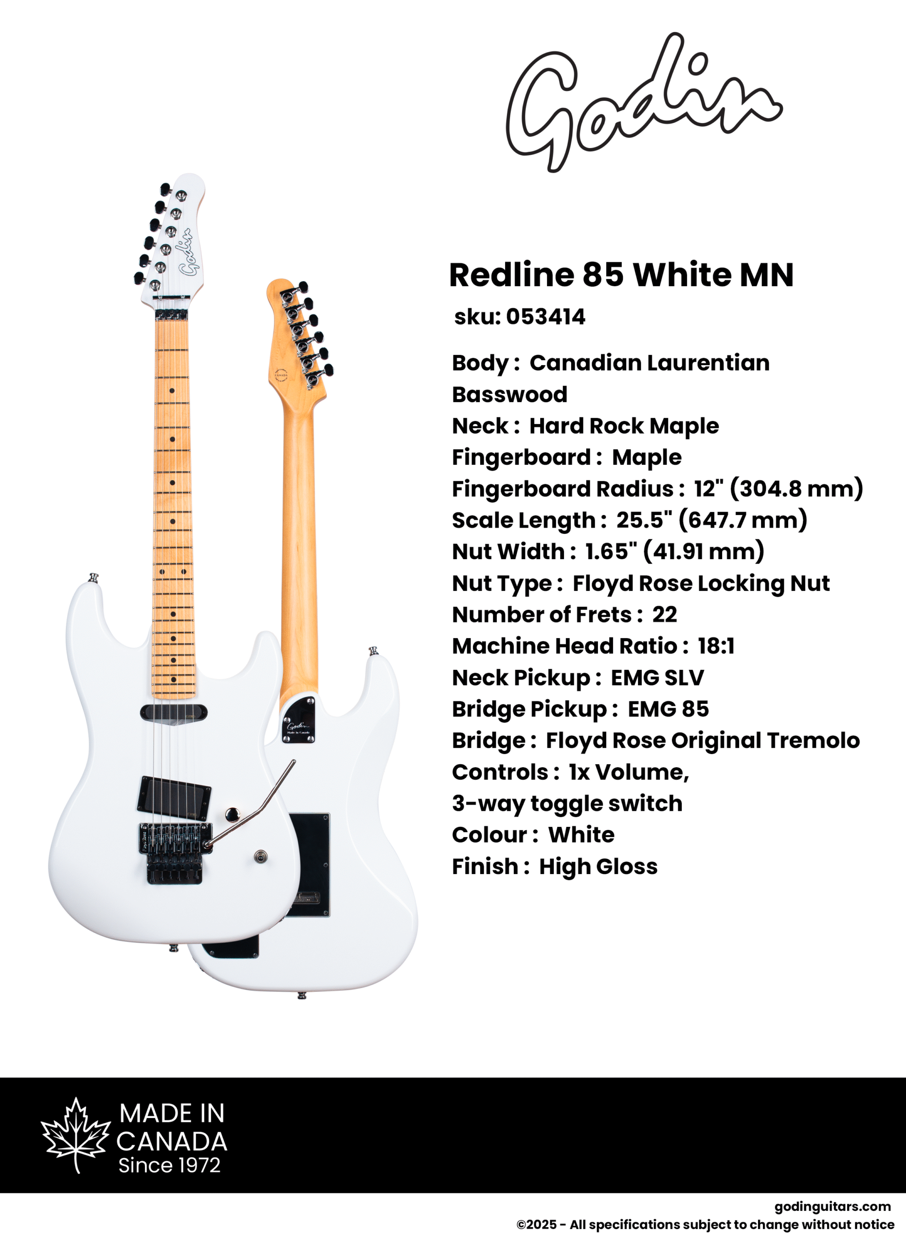 Nouveau pour 2025, la Redline 85 est une guitare spécialement conçue pour les passionnés de rock, désormais disponible en rouge ou blanc. Elle est équipée de micros EMG (85 au chevalet et SLV au manche), offrant une puissance sonore impressionnante et une clarté cristalline. Son tremolo Floyd Rose original permet des plongées de notes profondes tout en garantissant une stabilité de l’accord optimale. Avec son corps en tilleul canadien, son manche et sa touche en érable, cette guitare allie légèreté et résonance exceptionnelle. Fabriquée au Canada, la Redline 85 marie à la perfection robustesse et performance de haut niveau.