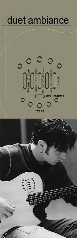 The Multiac Duet Ambiance models are equipped with a dual source system comprised of Fishman Aura electronics (mic imaging), blended with an under-saddle transducer. These state of the art custom electronics allow the player to select between 4 individual, high-end studio microphone settings. Choose between these blendable sound imaging mics via the 4-way selector switch. The Duet Ambiance produces superior dynamic response and frequency range. Ideal guitar for players looking for a an incredible, amplified nylon string sound and feel in a live and loud band setting with virtually no feedback. There are now two Duet Ambiance instruments in the Multiac family including the Multiac Nylon Duet Ambiance and the Multiac Grand Concert Duet Ambiance.