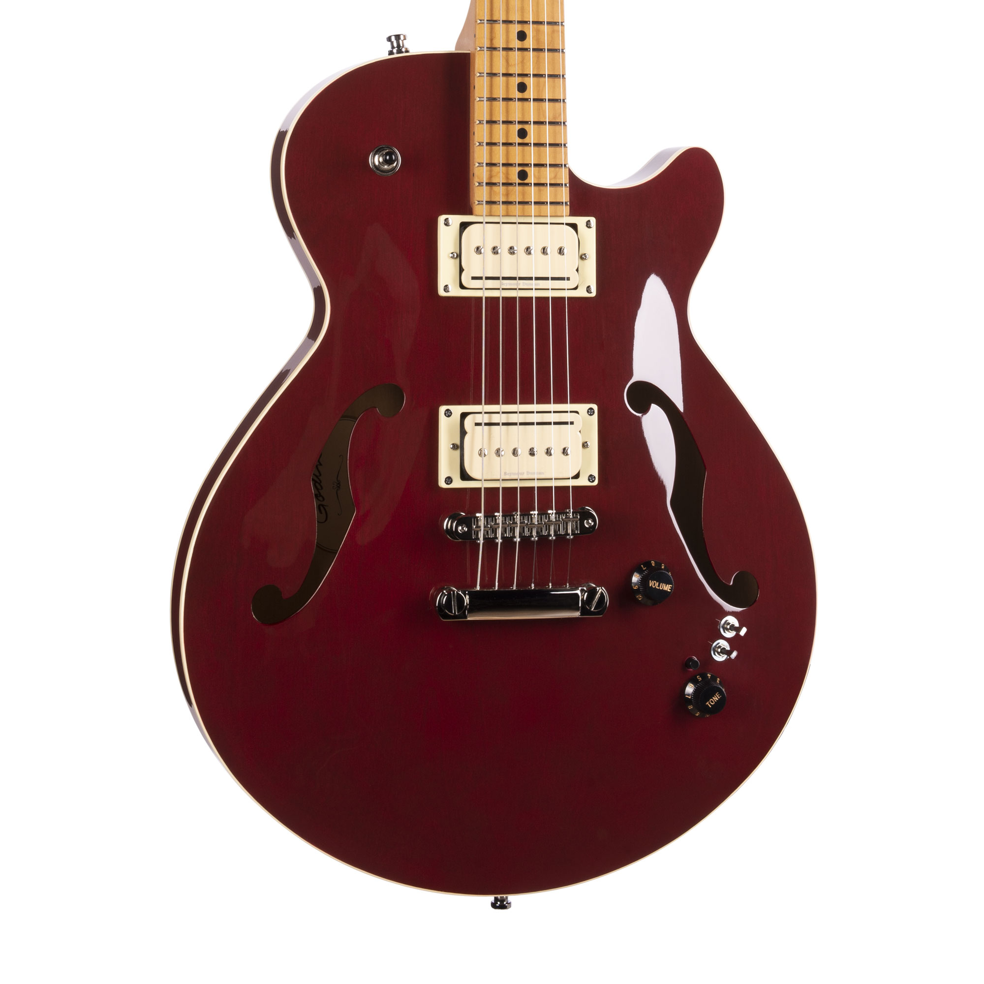 We are pleased to introduce the Montreal Premiere Pro Aztek Red, a guitar primed and ready for a wide variety of music styles, including country, pop, surf, jazz, blues, classic rock, and heavy rock. The Montreal Première features an innovative and uniquely sculpted centre block, allowing the body to resonate like no other guitar in its class! The Montreal Premiere Pro models boast pickups usually only found in custom shop guitars. Among the secret ingredients for the Aztek Red are a pair of made-in-the-USA Seymour Duncan P-Rails and the Godin H.D.R. system , for endless tonal options. Each unique hybrid humbucker can be split to give you a super fat, authentic vintage P90 tone, or can be split to the Rail coil for a classic Strat-like tone. With both coils on, you get a big-sounding humbucker that packs a powerful punch! Both P-Rails are controlled by a 3-way switch, volume and tone knobs, and two mini-switches. Made in Canada, the Montreal Première Pro Aztek Red is perfectly complemented by a Tune-o-matic style bridge with a brass stop tailpiece for optimal sustain and precise tuning.